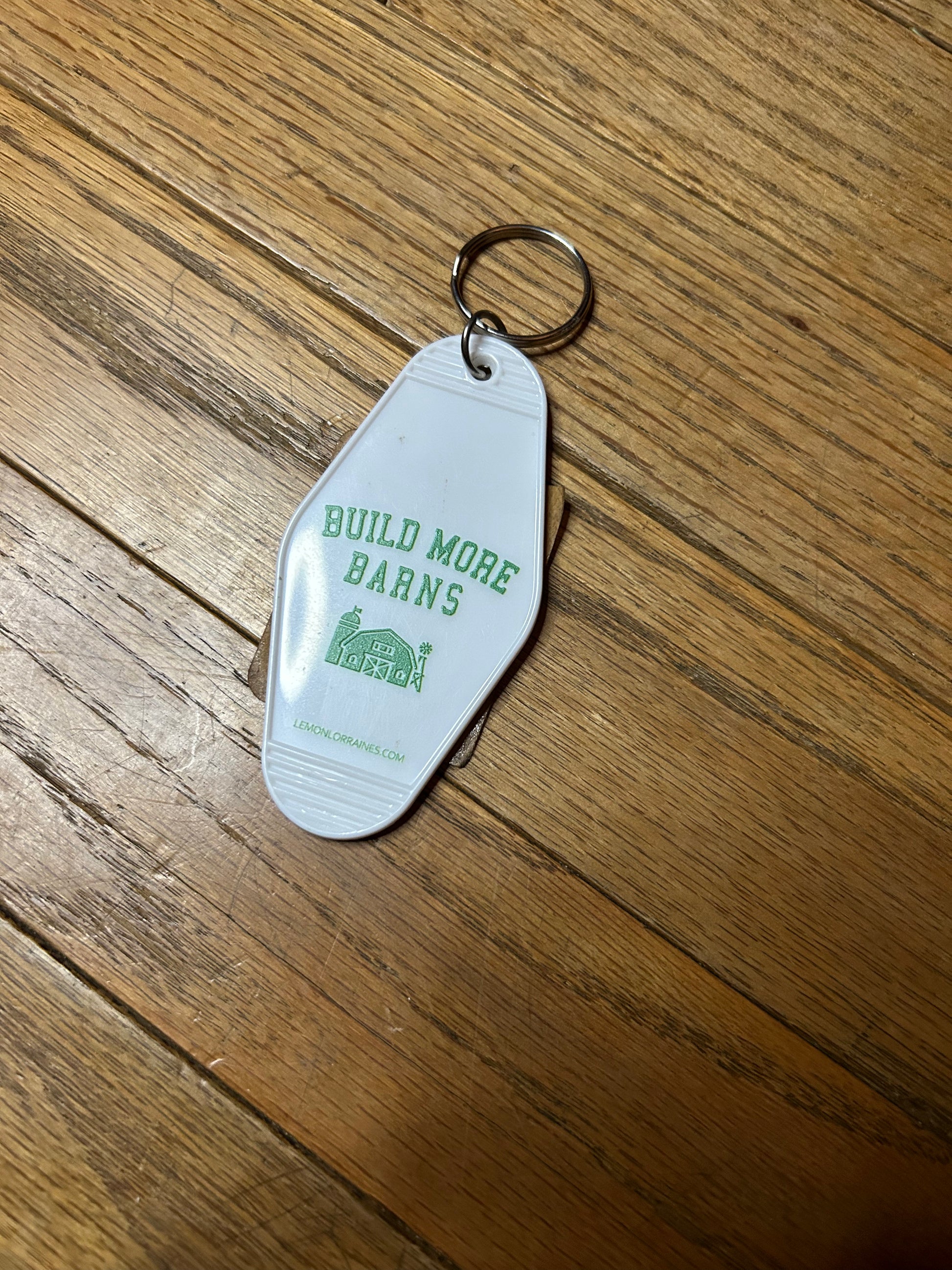Add a touch of rustic charm to your keys with our Build More Barns Motel Key Chain. This adorable keychain features a miniature wooden barn with the words "Build More Barns Motel" engraved on it. It's perfect for adding a bit of country flair to your everyday essentials. Made with high-quality materials, this keychain is durable and built to last. Get yours today and show off your love for all things farm-inspired.
