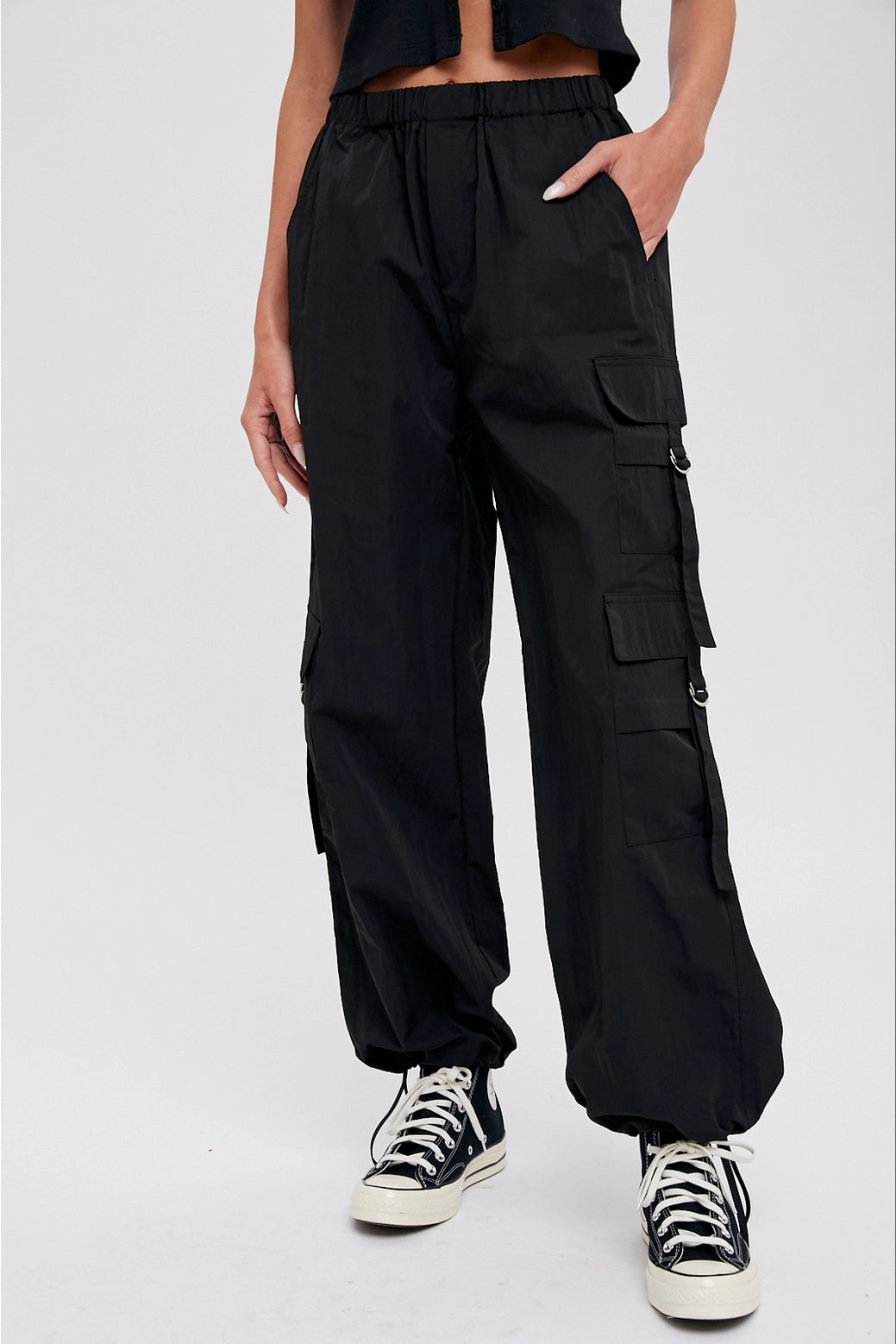 These women's cargo pants are the perfect blend of style and functionality. They come equipped with side pockets, providing convenient storage space for your essentials. Additionally, the leg pockets, complete with flaps, tabs, and metal buckles, not only add a touch of rugged charm but also offer additional storage options. The loose-fit legs ensure comfort and ease of movement, making them ideal for various activities. The elasticized drawstring at the hem allows you to adjust the fit and style of the pants, whether you prefer a tapered or relaxed look. With their practical design and trendy details, these cargo pants are a versatile choice for casual outings and outdoor adventures.