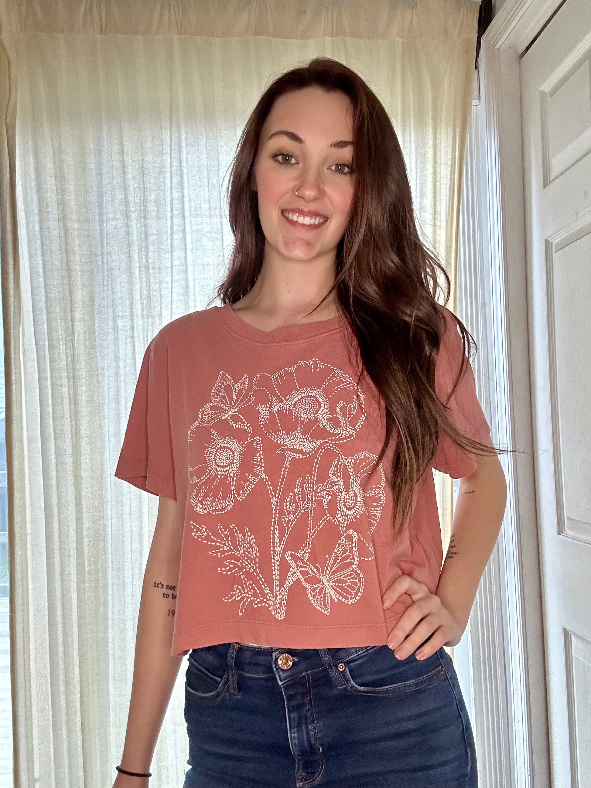 Our Flower Embroidery Graphic Cropped Tee is the perfect addition to your summer wardrobe. Made from soft-washed 100% cotton, this tee is both comfortable and stylish. The delicate floral embroidery adds a pop of color to the pretty pink fabric, making it a great choice for dressing up or down. The cropped length is perfect for pairing with high-waisted shorts or skirts, and the relaxed fit ensures all-day comfort. Elevate your casual look with this feminine and trendy tee.